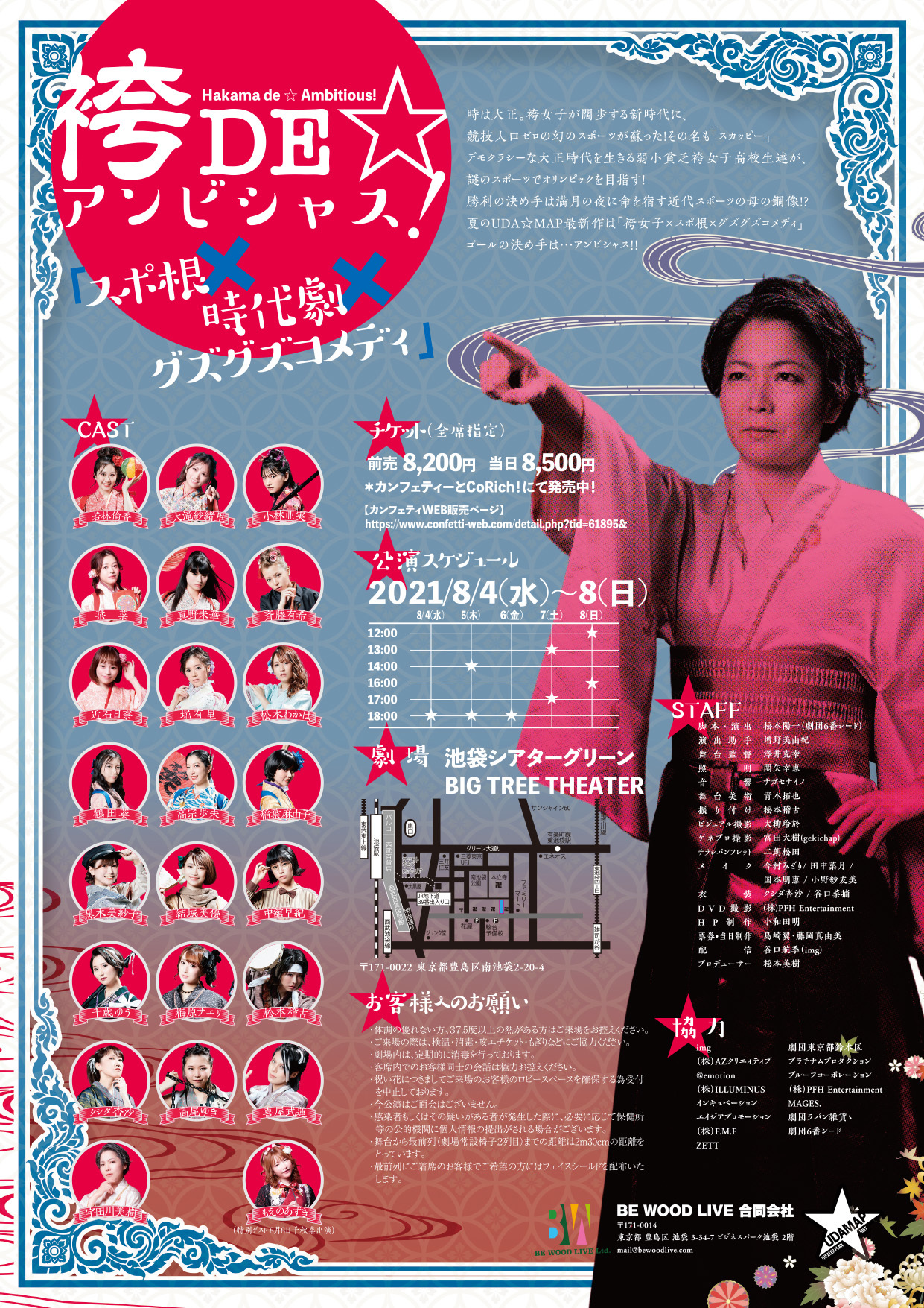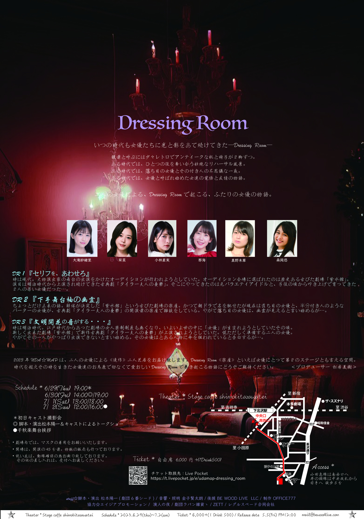 脚本・演出:松本陽一(劇団6番シード) / 演出助手:増野美由紀(劇団6番シード) / 舞台監督:二宮清隆(黒組) / 舞台美術:多賀慧(黒組) / 音響:兼坂香弥 / 照明:鈴木杏理(マーキュリー) / 衣装:平山空(企画演劇集団ボクラ団義) / 振付:松本稽古 / 楽曲制作:秤谷建一郎(Creative Company Colors) / 楽曲提供:めにぱら(many many paradigm) / ビジュアル撮影:渡辺慎一 / フライヤー・パンフレットデザイン:二朗松田 / ヘアメイク:Vert Hair&Make / 票券:島崎翼 / 製作:BE WOOD LIVE 合同会社