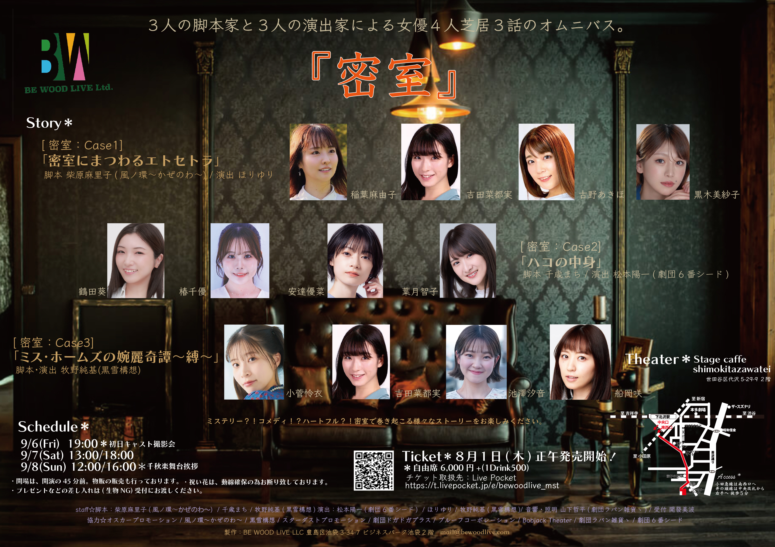 作・演出:牧野純基(黒雪構想) / 演出助手:盛岡明日香 / 舞台監督:澤井克幸(黒組) / 舞台美術:多賀慧(黒組) / 音響:兼坂香弥 / 照明:鈴木杏里(マーキュリー) / 衣装:平山空(企画演劇集団ボクラ団義) / 振付:エリザベス・マリー(CHAiroiPLIN) / ビジュアル撮影:山下雄基 / フライヤー・パンフレットデザイン:二朗松田 / ヘアメイク:Vert Hair & Make / 票券:島崎翼 / 制作:BE WOOD LIVE 合同会社
