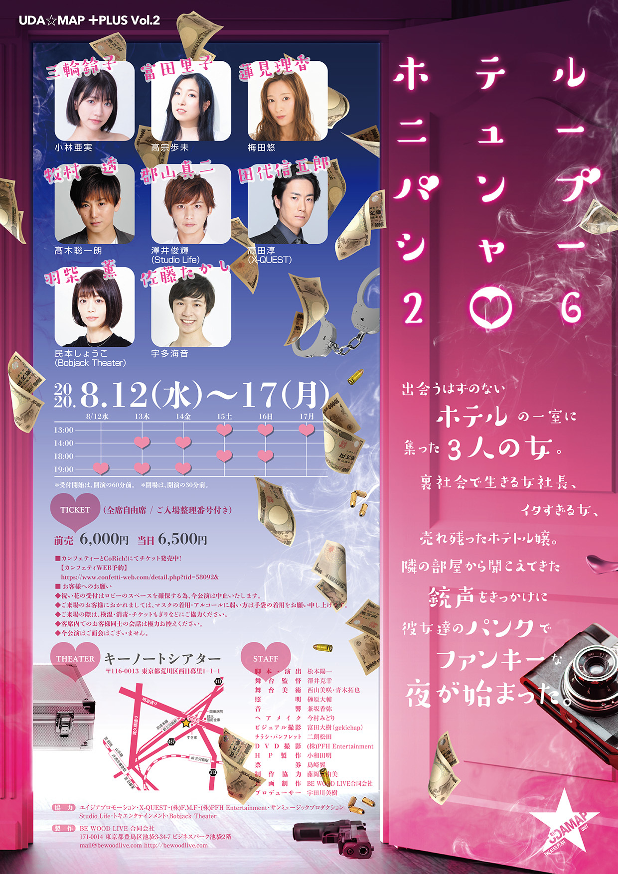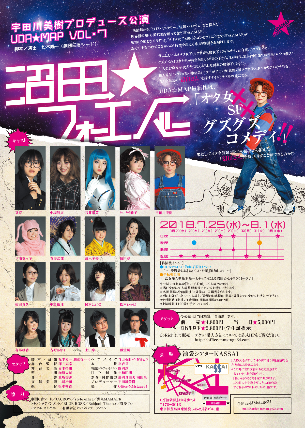 脚本・演出:松本陽一(劇団6番シード) / 舞台監督:T2UK / 舞台美術:青木拓也 / 照明:榊原大輔 / 音響:夕起ゆきお / 振付:megu / 宣伝美術:AMICORYU / 宣伝写真:nogaproject 田端誠一郎・松本幸子 / 制作協力:瀧田恵介 / プロデューサー:宇田川美樹 / 製作:Office-MMstage34