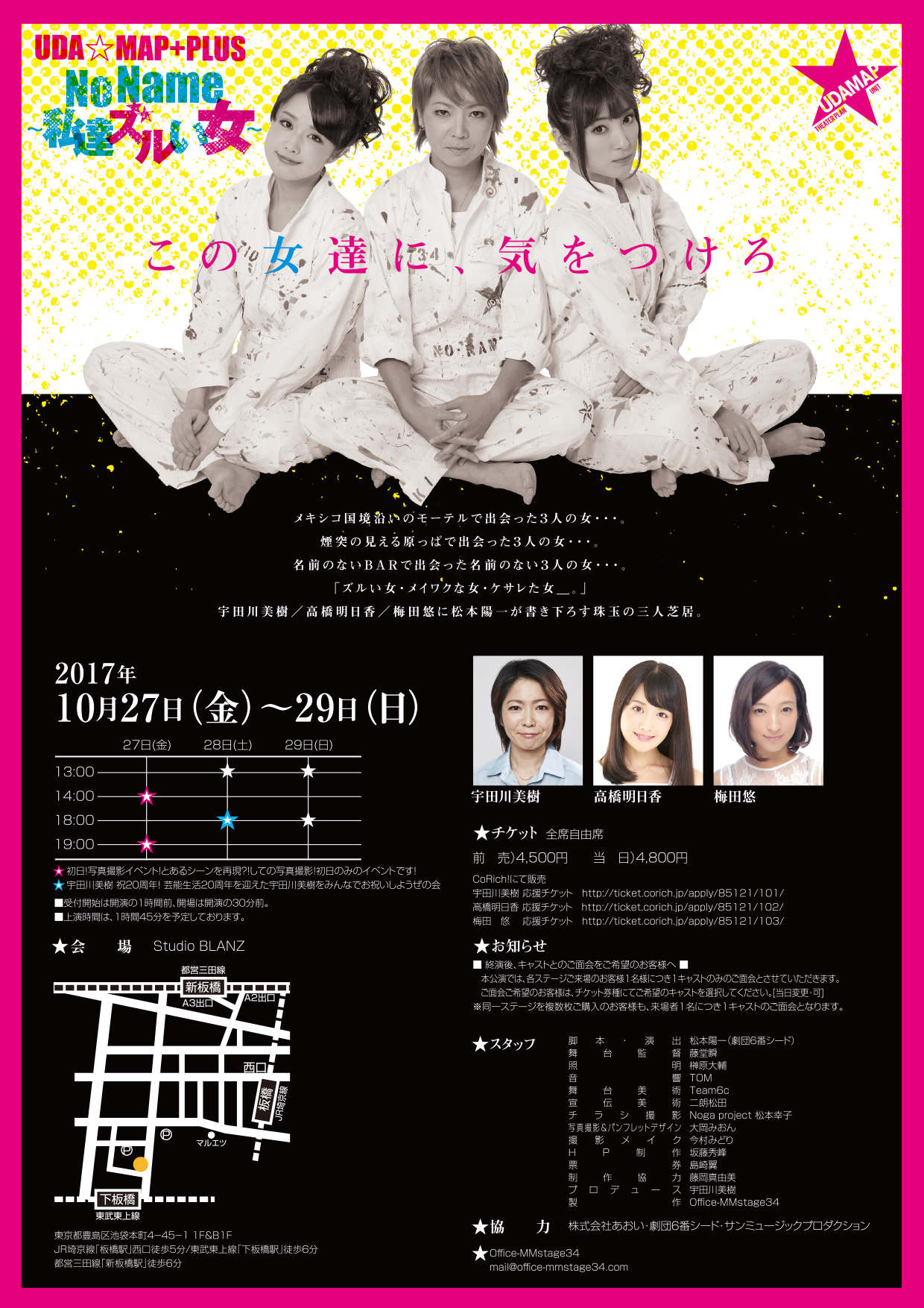 振付:松本稽古 / ヘアメイク:青山亜耶・今村みどり / 衣装:車杏里 / 写真撮影・物販デザイン:圓岡淳 / 映像撮影:ペイフォワードプロジェクト / HP制作:小和田明 / 票券・制作協力:藤岡真由美・潮田塁 / プロデューサー:宇田川美樹 / 製作:Office-MMstage34